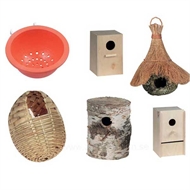 Holkar och bomaterial Fågelholkar till papegojor, parakiter, undulater och bon för finkar och kanarier. Även olika bomaterial för fåglarna att bygga bo med.