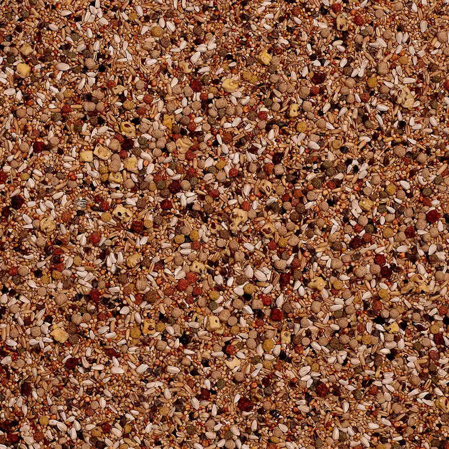 Fruktbitar som äpple och rönnbär ger naturlig smaklighet, medan tillsatt gritt främjar matsmältningen. Detta gör fodret till ett utmärkt val för både vardaglig utfodring och för avel.