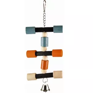 Robust leksak med träbitar och rep som uppmuntrar till klättring och tugg hos medelstora fåglar.