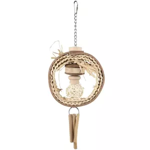 Naturlig leksak med läder, flätat strå, kokos och trä. Aktiverar papegojor och parakiter med varierad struktur och form.