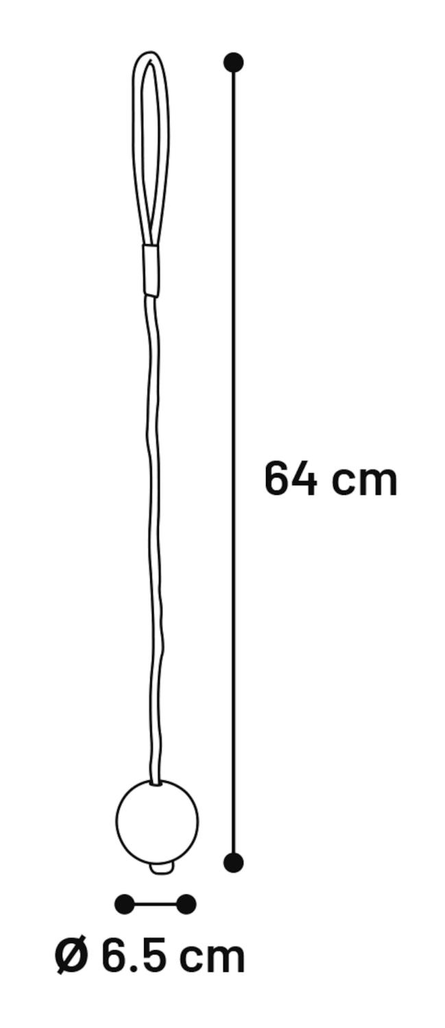 Bollen är 6,3cm i diameter, med rep som gör den lättkastad.