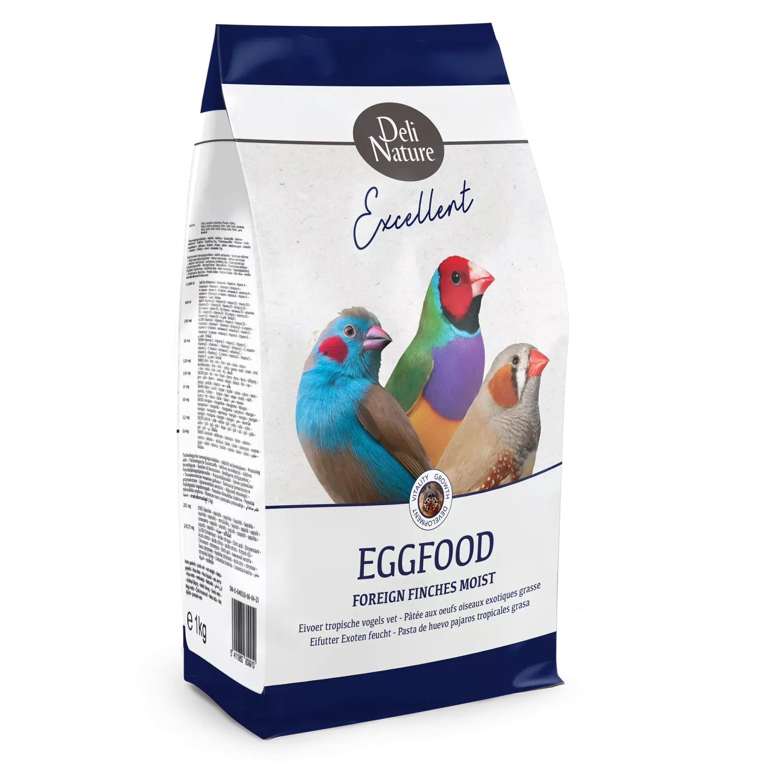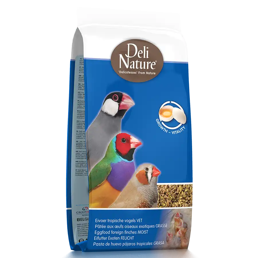 Tropiska finkar har särskilda näringsbehov under avel, uppfödning och ruggning. Deli Nature Eggfood Foreign Finches Moist är ett färdigblandat äggfoder med fin struktur som ger fullständig upptagning av näringen. Det är berikat med sötvattensräkor som bidrar med animaliskt protein, vilket är extra viktigt för tillväxt och utveckling av ungar. Tillsatsen av oregano och organiska syror stödjer en sund matsmältning och stärker immunförsvaret. Fodret är 100 procent redo att användas men kan även blandas med groddfrön, frukt eller grönsaker.