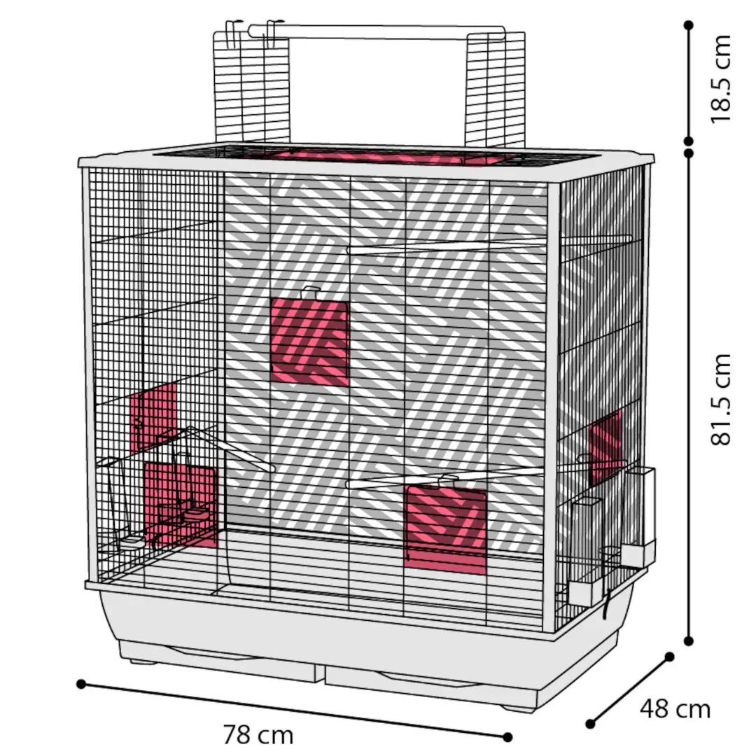 Taköppningen används tillsammans med den medföljande sittpinnen och gör det enkelt för fågeln att komma ut på ett tryggt och kontrollerat sätt. Buren har tre dörrar i fronten och två på sidorna, vilket ger smidig åtkomst vid matning och rengöring. Botten består av två utdragbara plasttråg som gör städningen enkel utan att störa fåglarna.