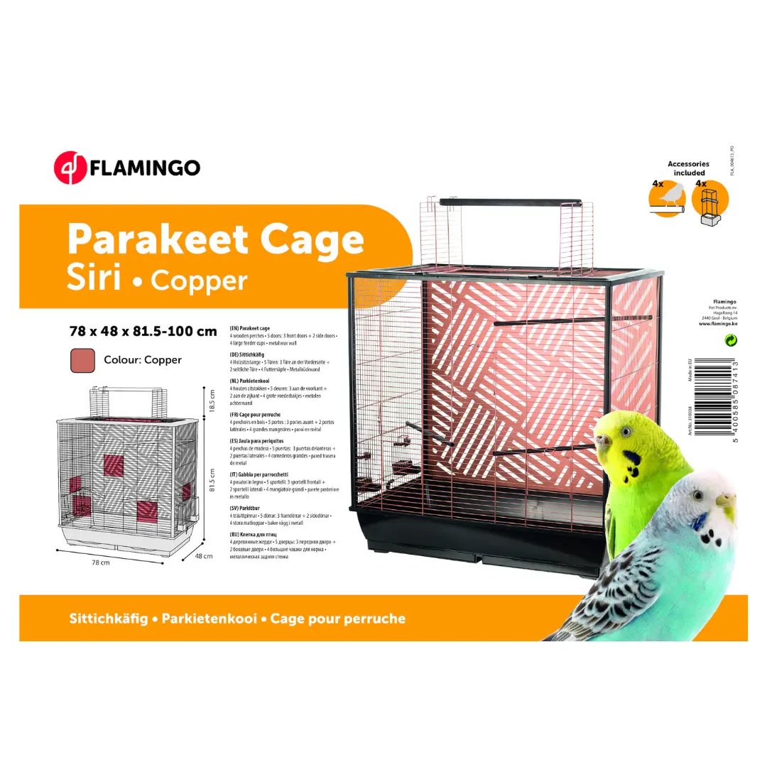 Siri är en rymlig och modern parakitbur som kombinerar snygg design med praktiska funktioner. Den dekorativa kopparfärgade bakpanelen ger ett stilrent uttryck och buren erbjuder gott om plats för undulater och mindre parakiter att röra sig, klättra och aktiveras.
