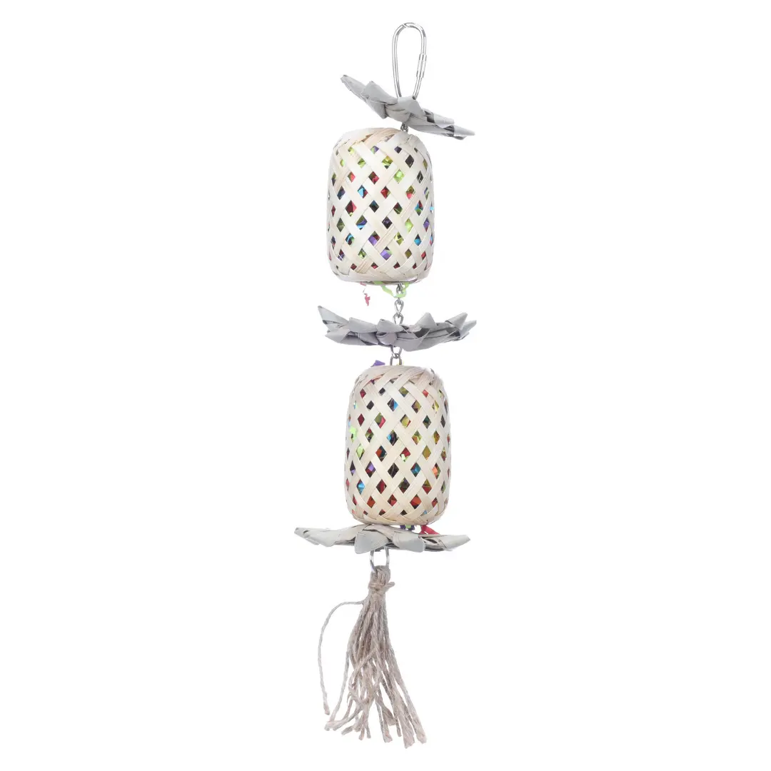 Naturlig hängleksak i bambu, palmblad och jute som aktiverar småfåglar och ger lek, sysselsättning och utforskarglädje.