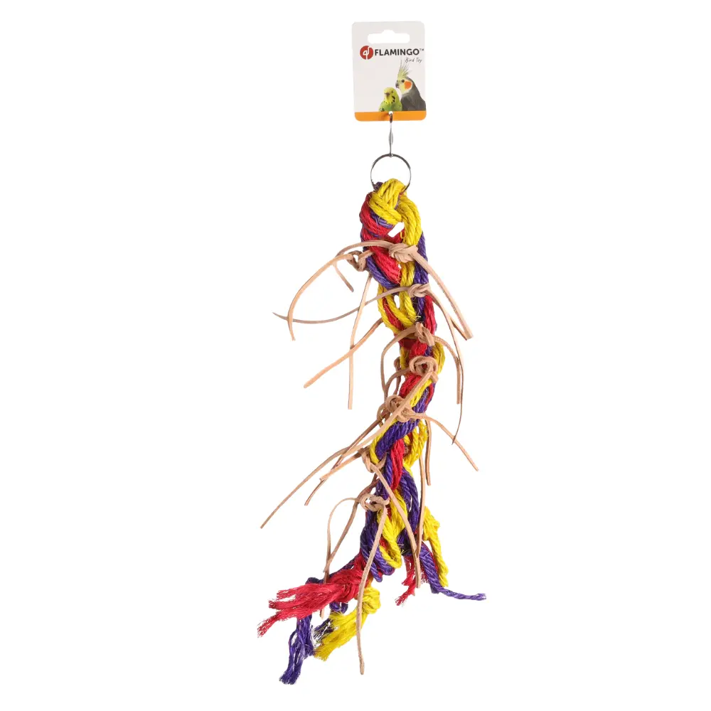 En färgstark hängleksak med flätade rep, läderremmar och färgglada tofsar som fågeln kan dra i och bita på. Materialet består av naturlig sisal och läder, vilket tillfredsställer behovet av att gnaga och plocka. Leksaken fästs enkelt i burens tak med metallkrok och passar perfekt för parakiter och andra mindre fåglar.