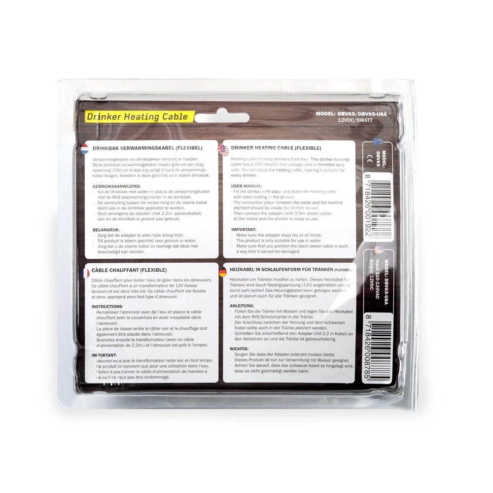 Denna flexibla värmekabel är ett smart hjälpmedel för att förhindra att vatten fryser i dricksflaskor och vattenautomater under vintern. Kabeln är försedd med en skyddande hylsa i rostfritt stål som gör den både slitstark och säker att använda. Ansluts enkelt till den medföljande 12V-adaptern och placeras direkt i vattenbehållaren. Kabeln är vattentät och säker att använda med lågspänning. Total längd på anslutningskabel: 2,2 meter. Effekt: 5 watt.