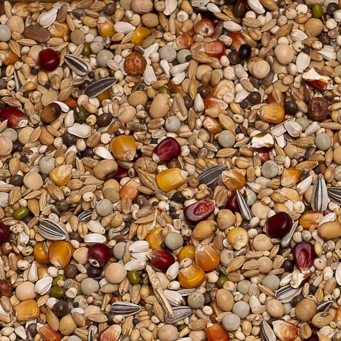 - Består av 27 olika ingredienser: 4 typer av majs, råvaror för essentiella proteiner, aminosyror och många små feta frön som främjar ruggning och säkerställer perfekta nya fjädrar.