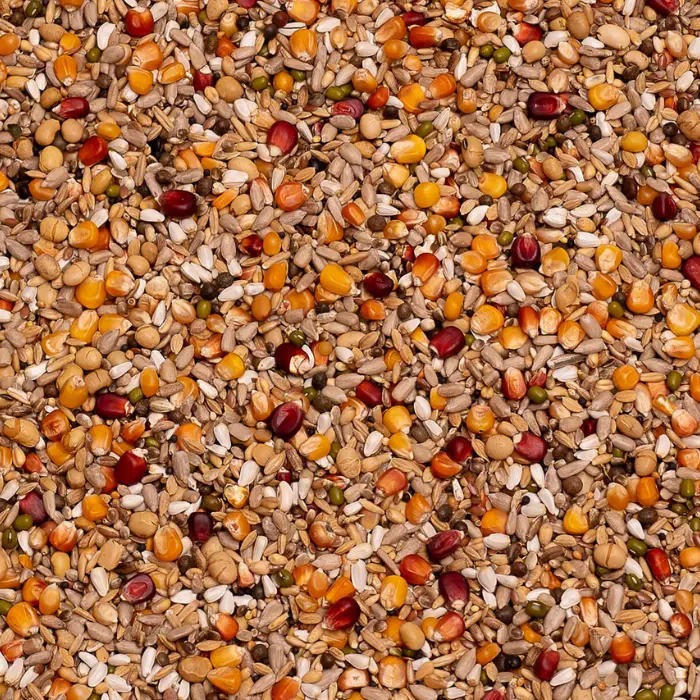 Skalade solrosfrön, rostad soja, Bordeaux-, merano-, cribbs-, små cribbs- och popcornmajs, hampa, skalad havre, vit vete, cardy, paddy ris, vicker, linfrö, vit frö, plata majs, brunt ris, mungbönor, svart rybs, rybsfrö, mariatistel, gul och vit millet, sesamfrö.