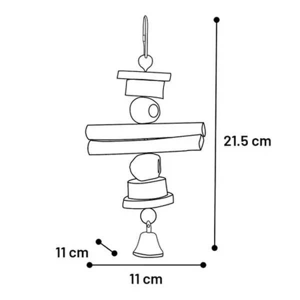 Robust leksak med träbitar och rep som uppmuntrar till klättring och tugg hos medelstora fåglar.
