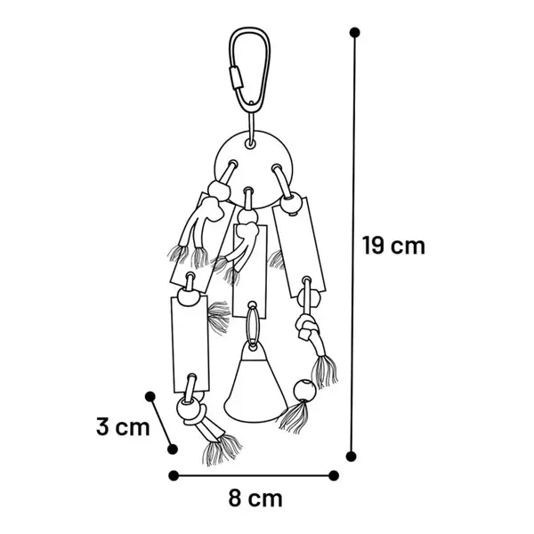 Denna dekorativa hängleksak är designad för att ge mindre fåglar som undulater och parakiter lekfull stimulans i burmiljön. Tillverkad av trä, bomull och plast, med färgglada rep och pärlor som lockar till både klättring och pickande. Kombinationen av mjuka och hårda material ger variation och bidrar till att förebygga tristess. Leksaken fästs enkelt i buren med ett stabilt upphängningssystem i metall. Ett utmärkt val för att aktivera nyfikna fåglar på ett säkert och naturligt sätt.