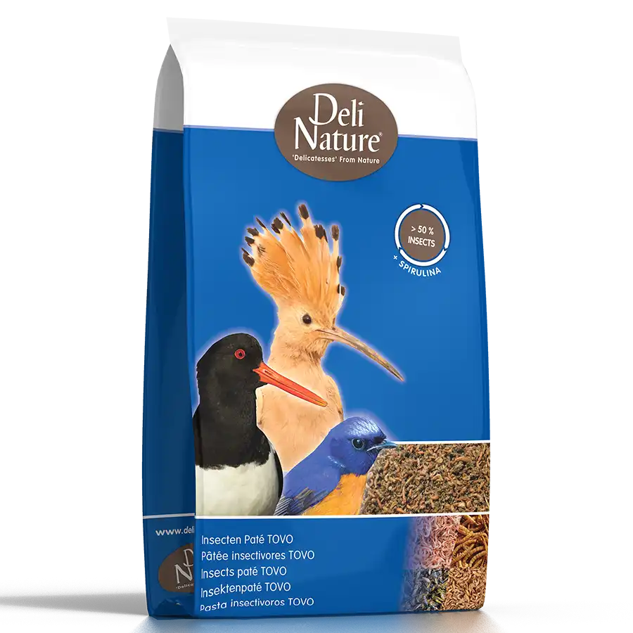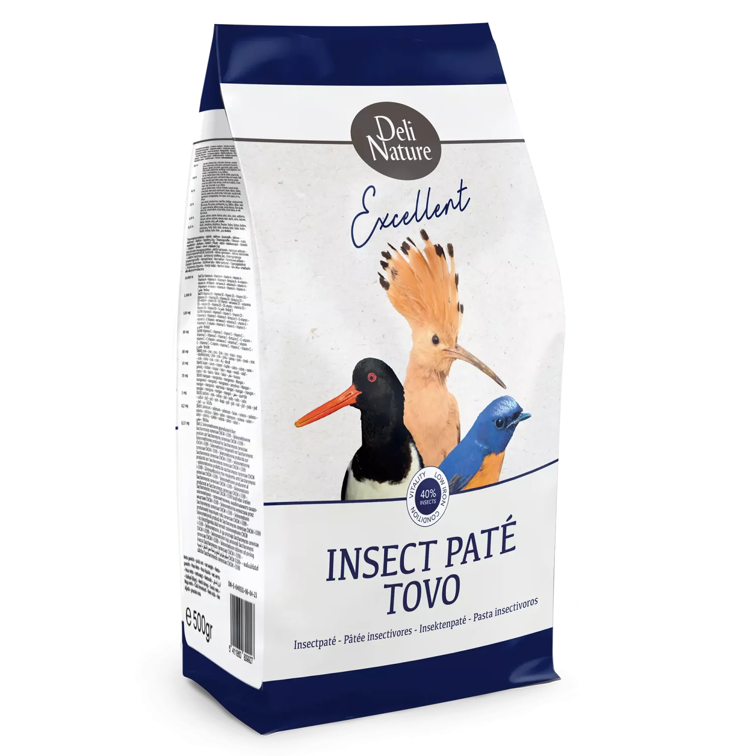 Insektfoder Tovo är ett premiumfoder med hög andel insekter, musslor och kräftdjur som täcker behovet av animaliskt protein hos insektsätande fåglar som näktergal, blåhake och sädesärla samt vadarfåglar som strandskata och tofsvipa. Fodret är 100 procent färdigt att använda och är även ett idealiskt komplement till andra arter som behöver extra protein inför eller under häckning. Blandningen innehåller bland annat torkade mjölmaskar, syrsor, sötvattensräkor och dafnie, vilket ger en bred variation av animaliska proteiner. Tillsatt spirulina, oregano och organiska syror bidrar till stark immunitet, god matsmältning och allmän vitalitet.