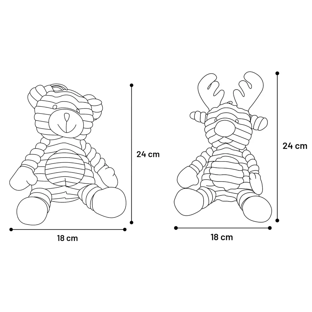 Ge hunden en extra rolig jul med dessa charmiga julleksaker i mjuk plysch och ribbad corduroy. Leksakerna finns i två varianter: Ren med bruna horn och röda detaljer samt en beige nalle med rödgröna tassar. Den inbyggda pipen väcker lekglädje och gör dem lika uppskattade för bus som för mysiga stunder under julen.