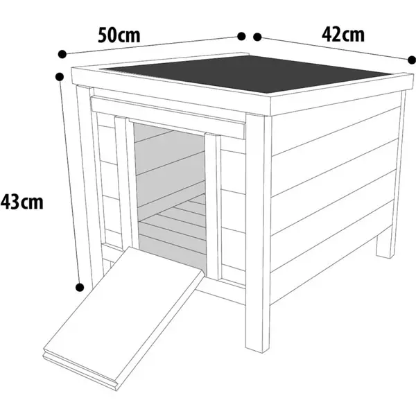 Lådan har en ramp vid ingången, vilket gör den lättillgänglig även för äldre eller mindre djur. Dörren är försedd med ett vridlås som håller den på plats. Huset levereras omonterat och är enkelt att sätta ihop.