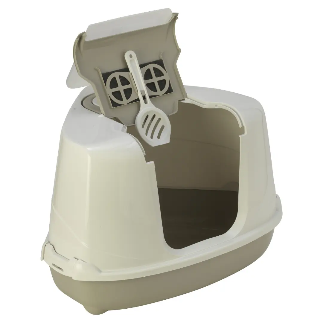 Rymlig hörn-kattoalett med swingdörr, aktivt kolfilter och hög designad struktur för att passa jämte vägg eller i hörn.