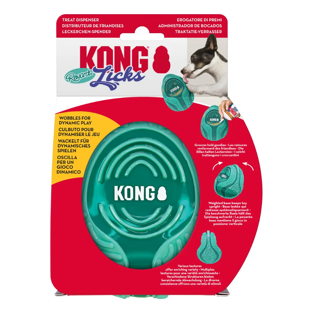 En rolig och utmanande aktiveringsleksak från KONG som håller hunden sysselsatt längre. Den viktade botten gör att wobblern vaggar oförutsägbart när hunden försöker slicka eller få ut godiset. Den mönstrade insidan håller fyllningen på plats, vilket förlänger lektiden och stimulerar naturliga slickrörelser som lugnar och minskar stress. Fyll den med till exempel våtfoder, leverpastej eller jordnötssmör för extra belöning.