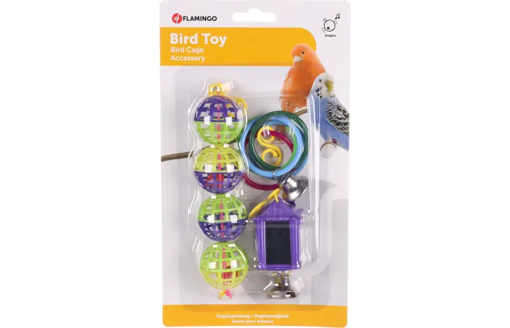 Detta leksakspaket passar perfekt för undulater som behöver aktivering. Olympiaringarna uppmuntrar klättring, lyktan svajar lätt, och boll-leksaken innehåller spegel, små kulor, ringar och både klingande och skallrande bjällror.