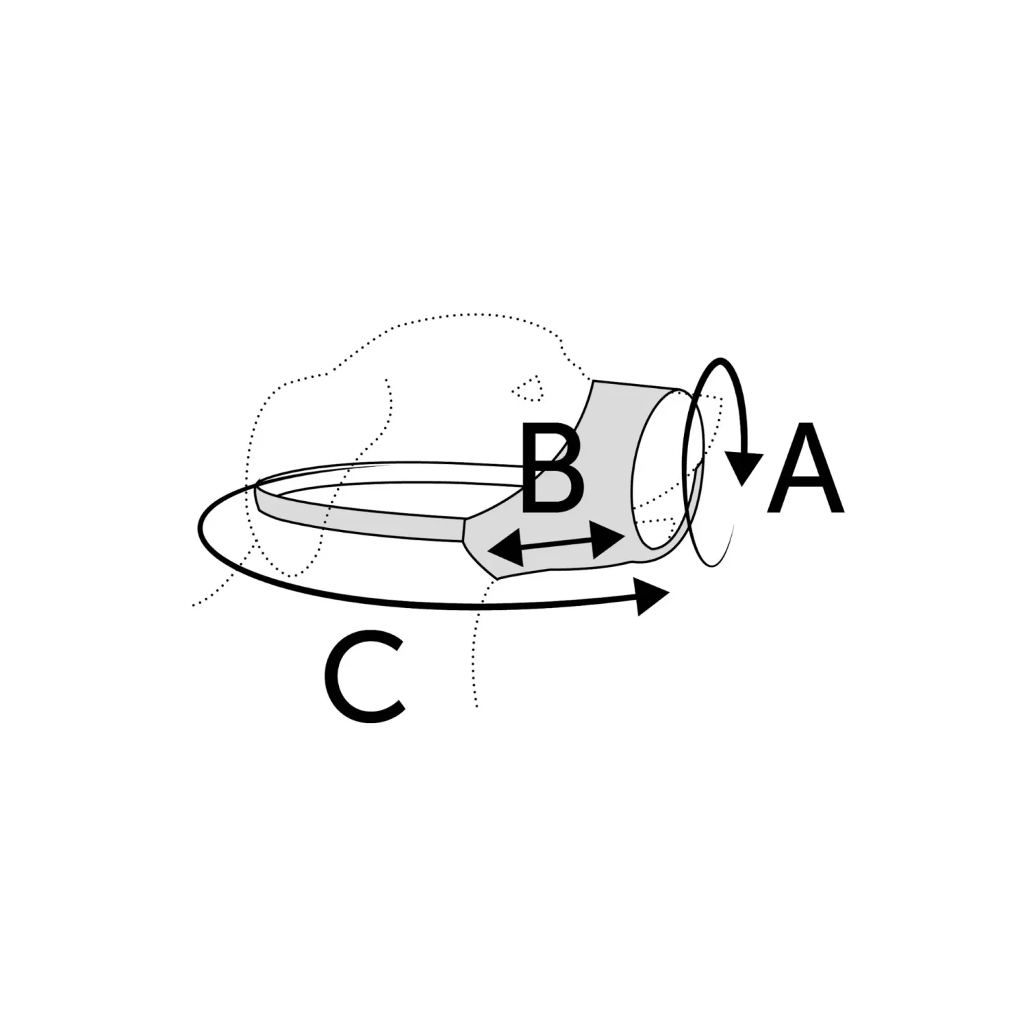 XL (ex. Golden Retriever, Grand Danois): Nosa (A) 25–27 cm, Bredd nos (B) 9 cm, Nacke (C) 45–102 cm