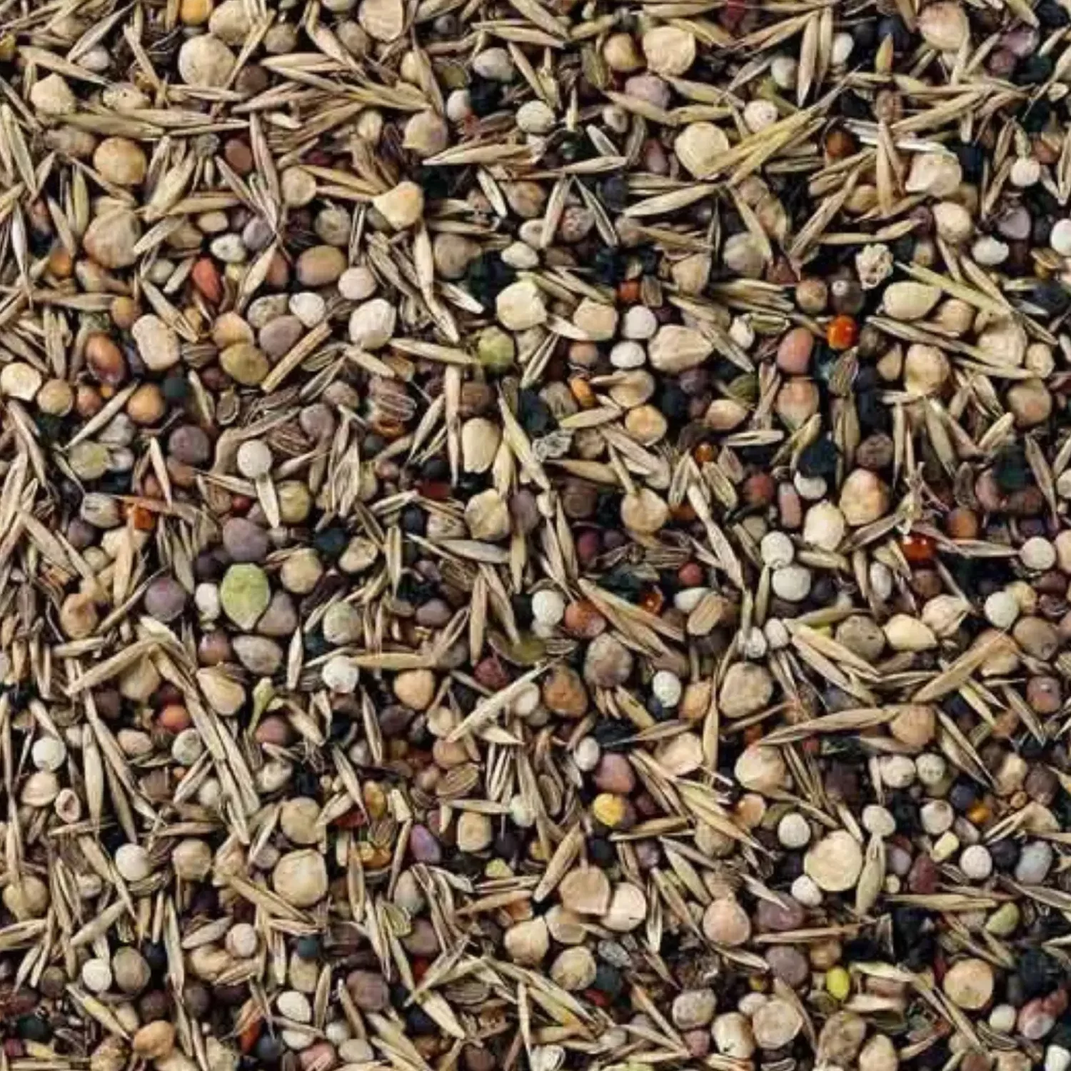 Svart raps, gul hirs, spenatfrö, gräsfrö, klöverfrö, röd sorgho, rädisafrö, linfrö, bovete, anisfrön och bishops lace.