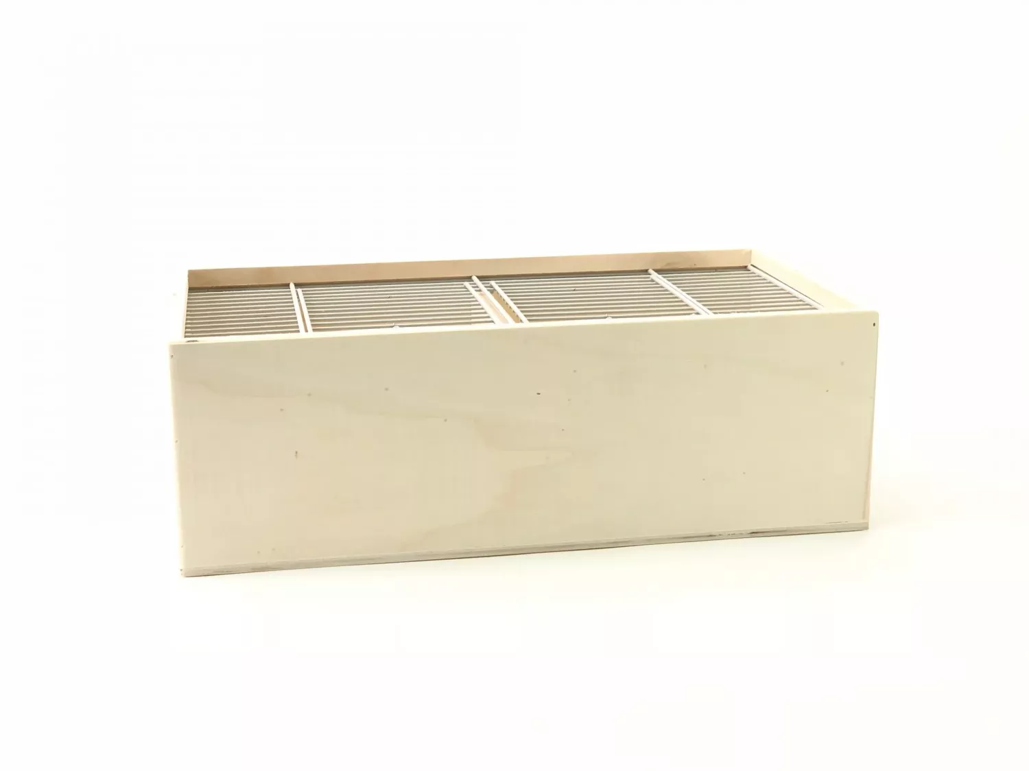Trävoljär för upp till 3 småfåglar. Utdragslåda för enkel rengöring. 6 sittpinnar, 1 dörr. Kan hängas upp på väggen. Storlek: 90 x 38 x 66 cm.