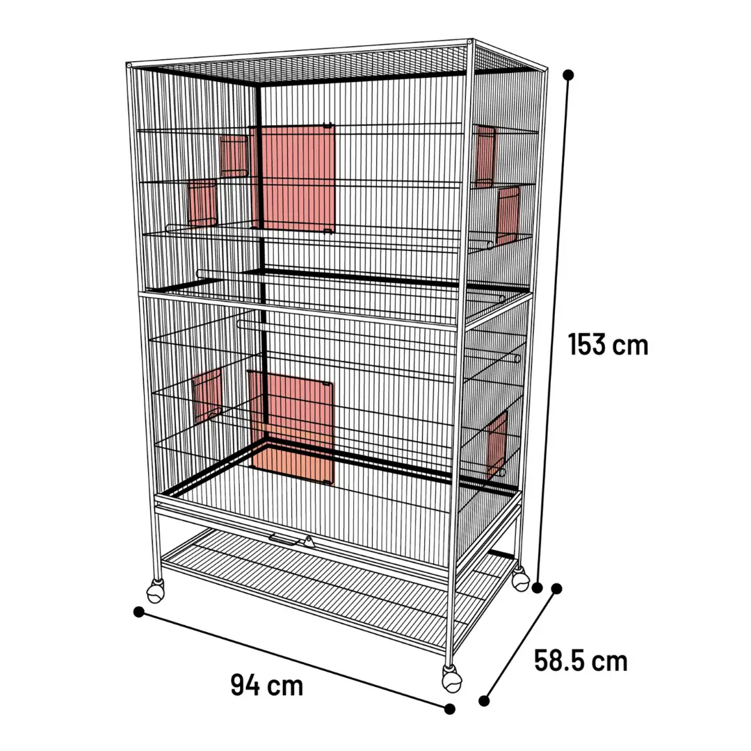 Den är 94 cm lång, 58,5 cm bred och 153 cm hög, vilket gör den väl anpassad för flera små och medelstora fågelarter. Den moderna anthracite-färgen smälter in i hemmet och ger voljären ett elegant uttryck.
